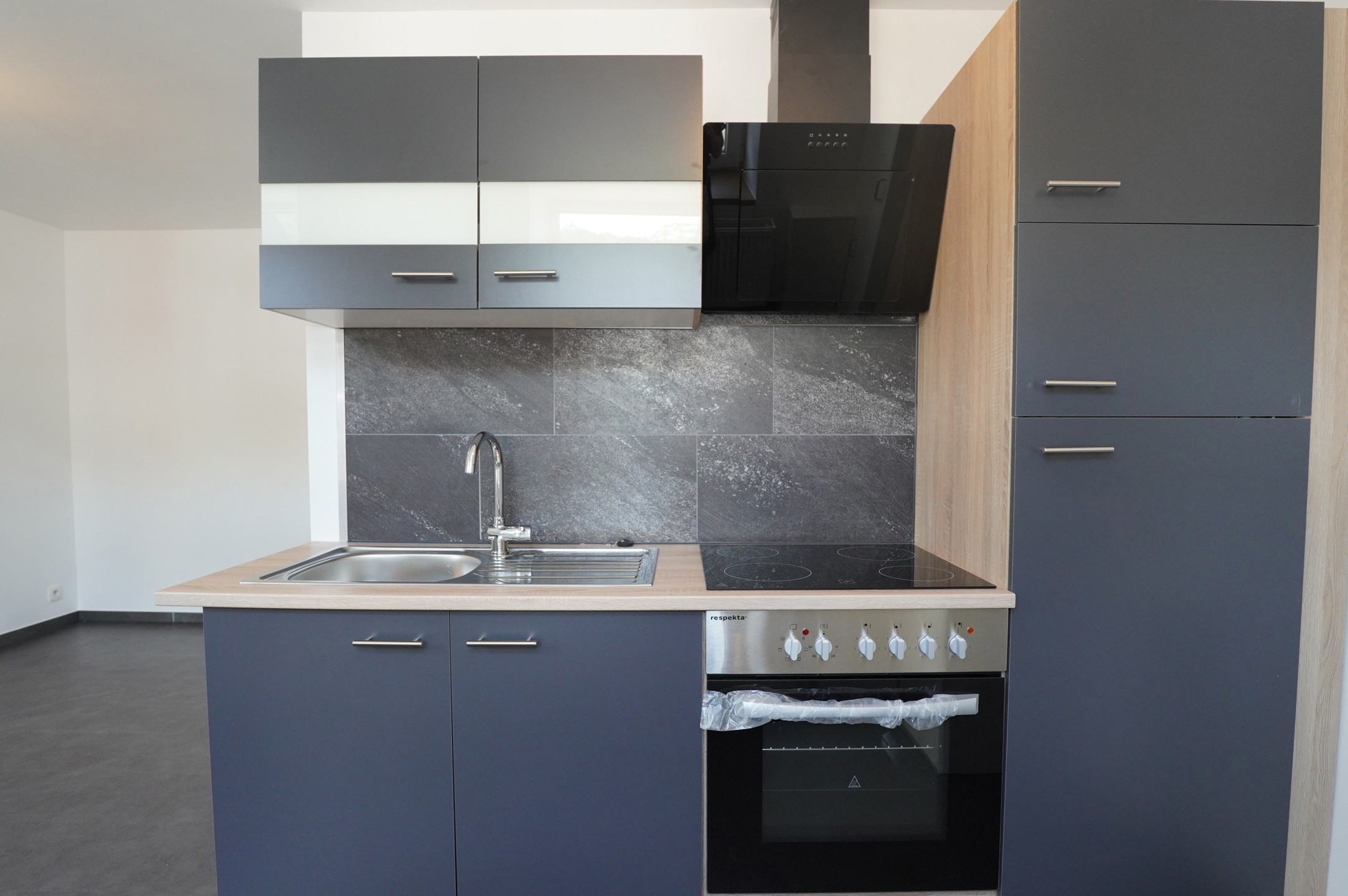 Eingangsbereich, separates WC mit Waschbecken, großes Wohnzimmer, neue Einbauküche mit Essbereich, Badezimmer mit Dusche, Waschbecken und Anschluss für eine Waschmaschine, 1 Schlafzimmer.
