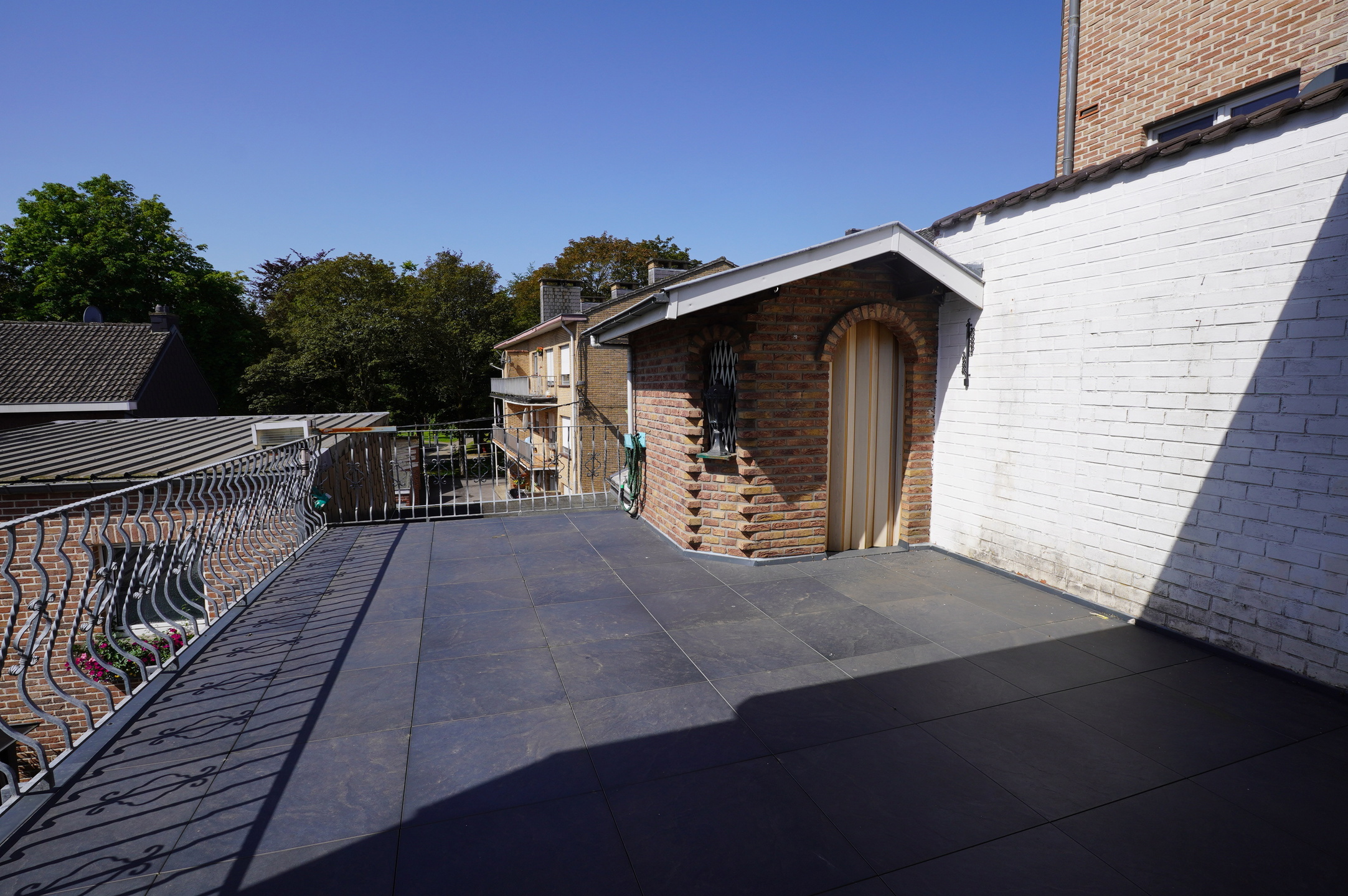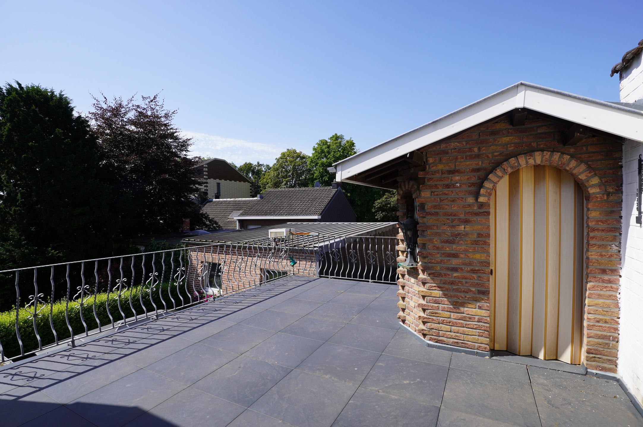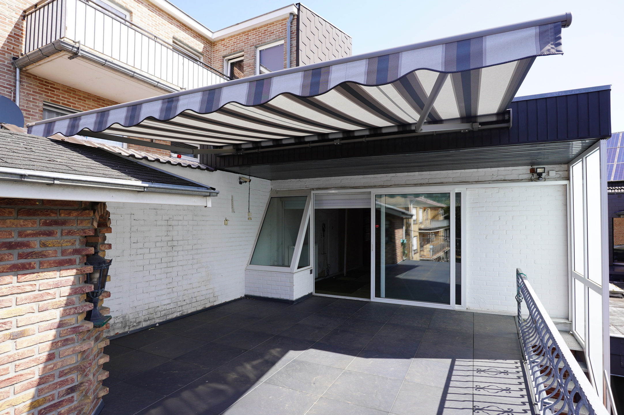 Die Terrasse ist mit einer neuen großen elektrischen Markise ausgestattet und ermöglicht den Zugang zum Gartenhaus sowie zur Rückseite des Gebäudes, wo sich der Abstellkeller und die große Garage befinden.