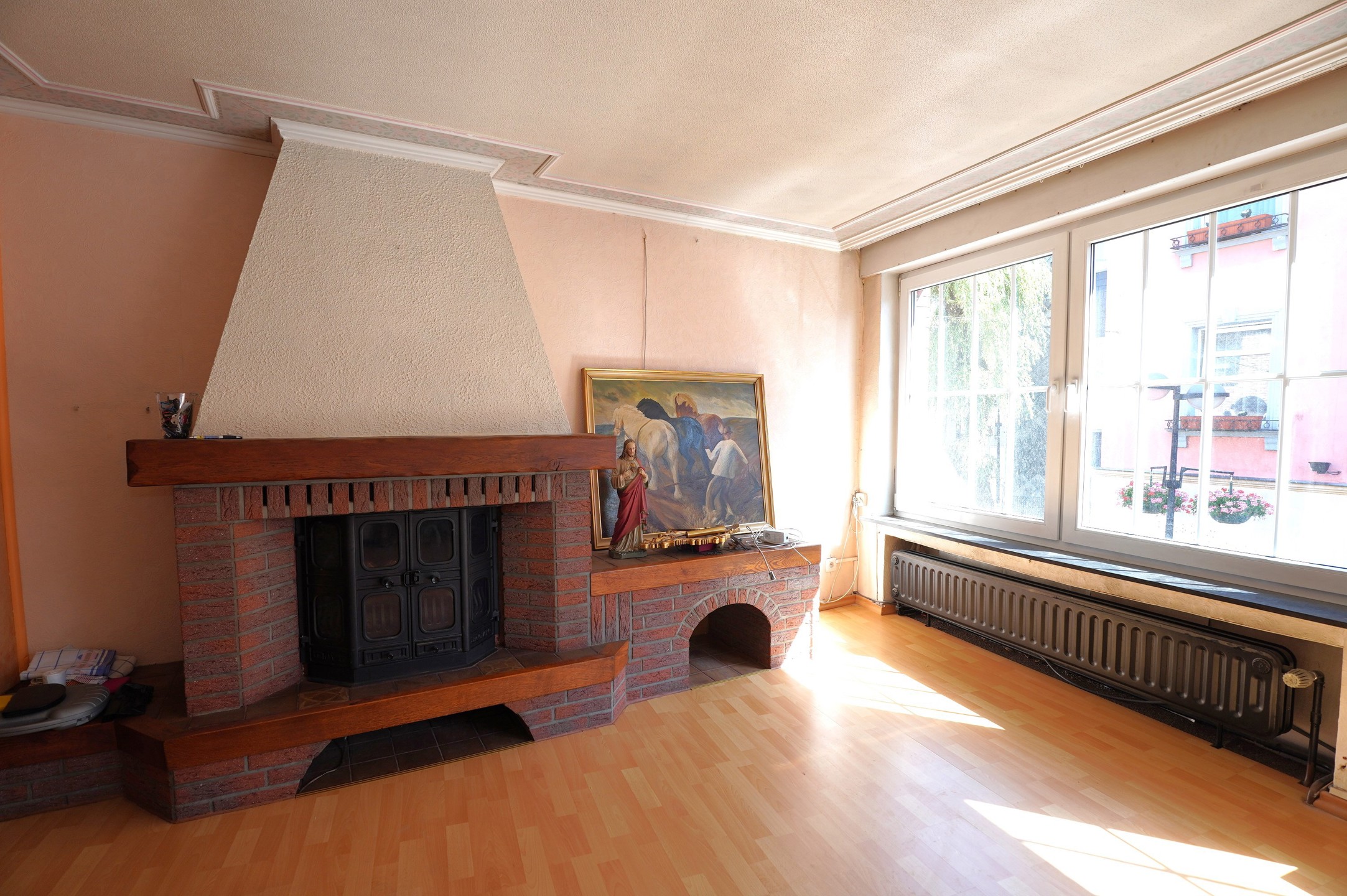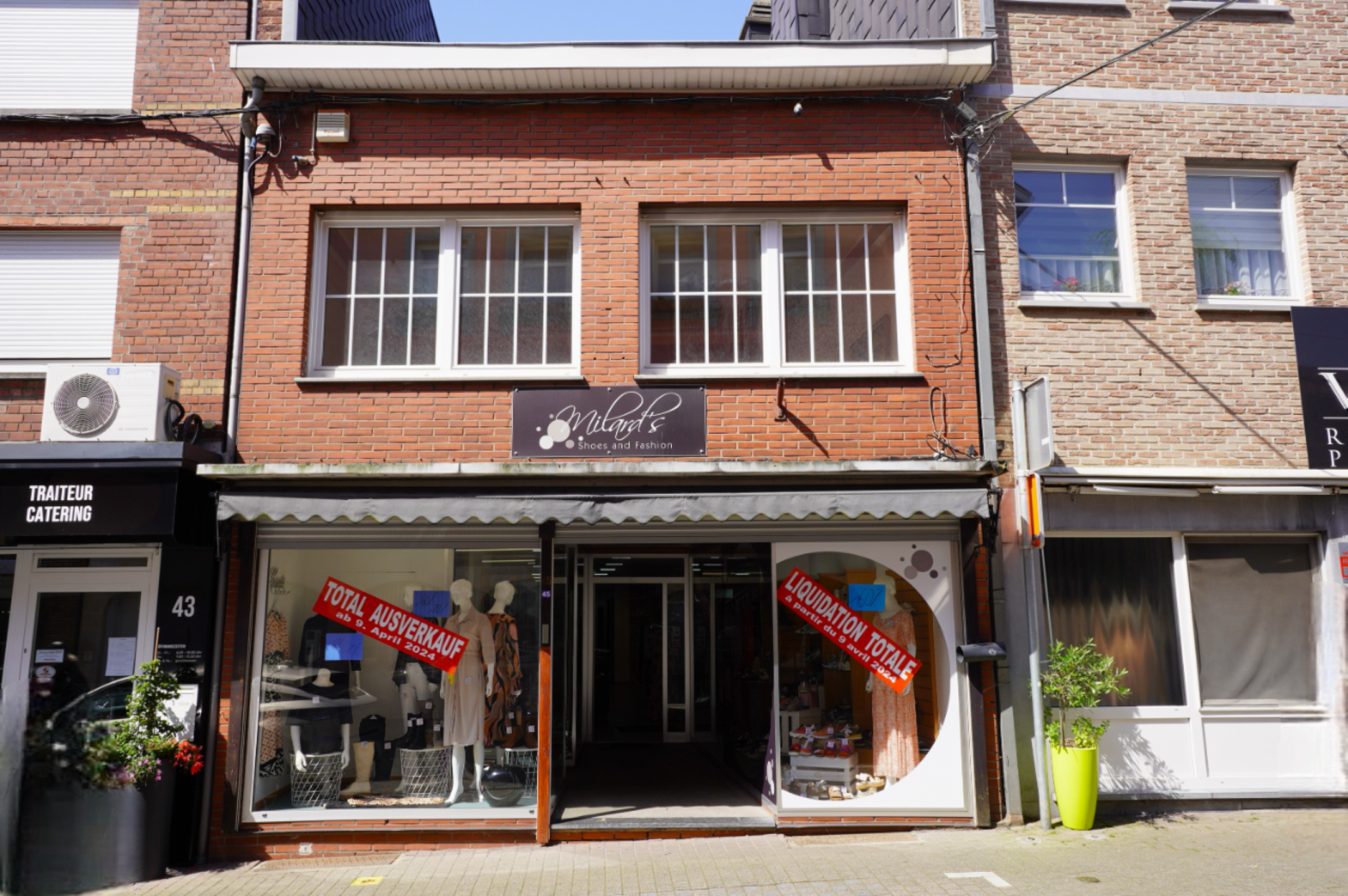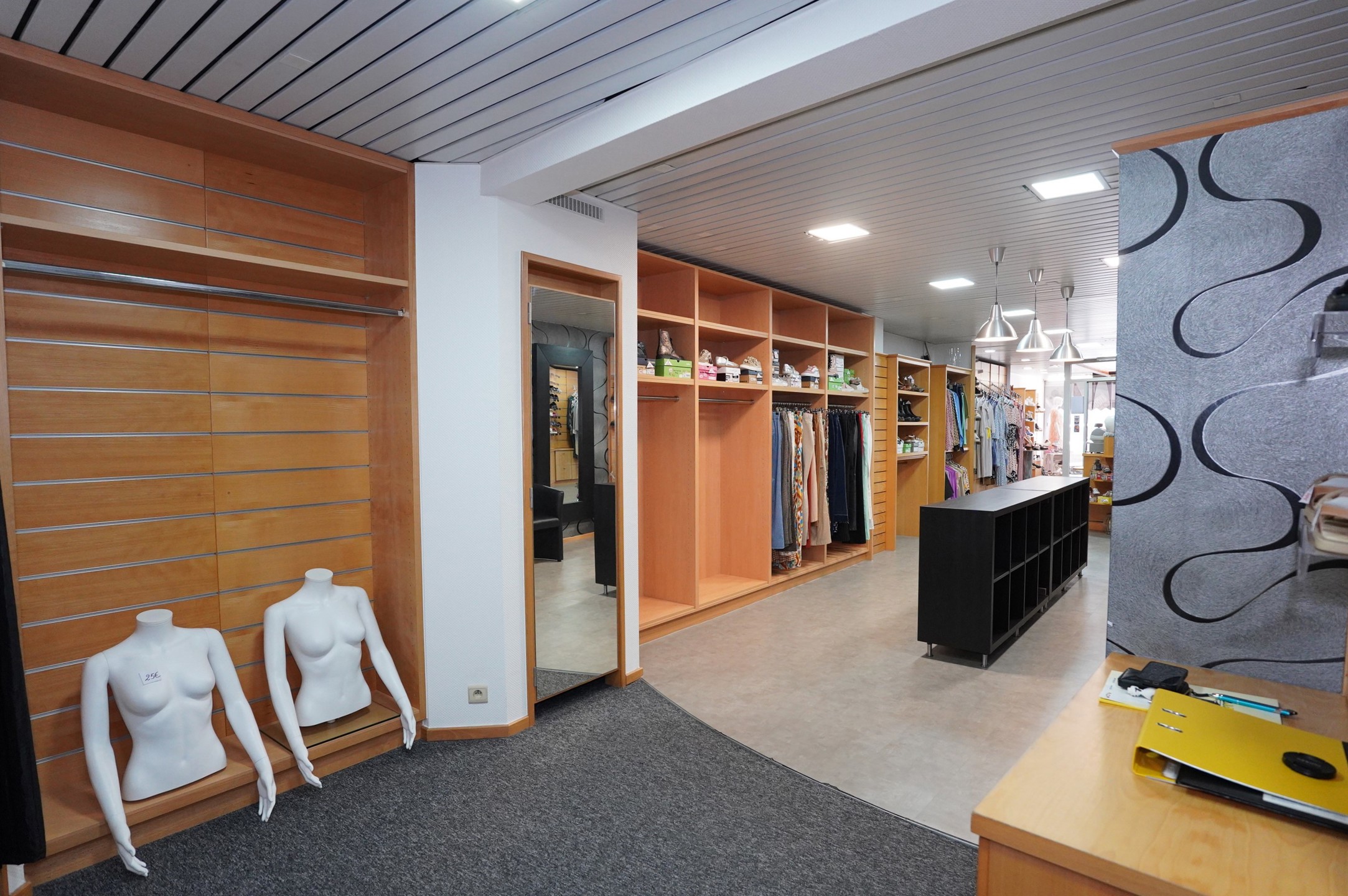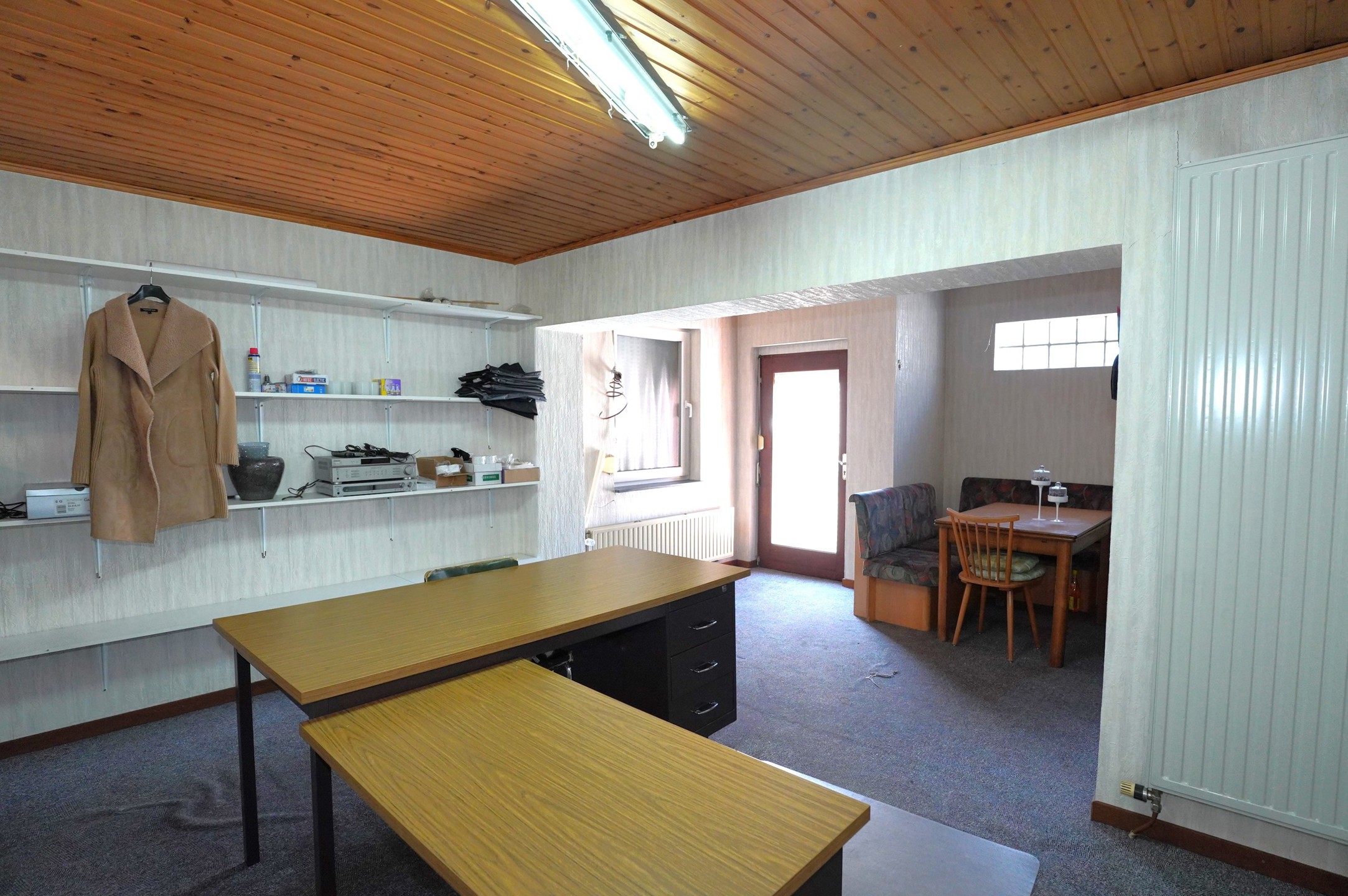 * Erdgeschoss mit Gewerbefläche: Geschäftseingang mit 3 Schaufensterflächen (16m²), elektrische Rollläden, Markise an der Fassade, geräumige Gewerbefläche (+-40m²) mit 2 Umkleidekabinen, Abstellraum, großer Lagerraum (22m²) mit Regalen auf Schienen, separates WC, Bürobereich(27m²) und Küchenzeile, möglicher Zugang zur Rückseite der Immobilie, wo sich ein Abstellkeller(16m²) und die Garage(40m²) befinden.