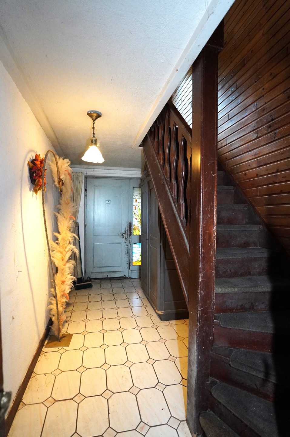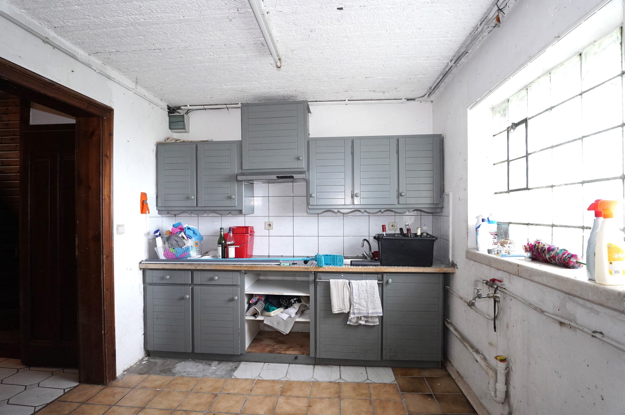Hall d’entrée avec cage d’escalier en bois, menant aux étages, cuisine semi-équipée, accès à la terrasse et son jardin, buanderie avec accès pour machine à laver ainsi que la chaudière centrale à condensation au mazout, wc séparé et deux garages.