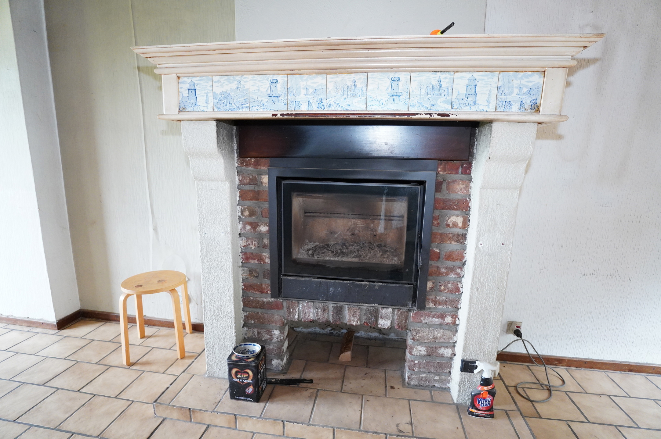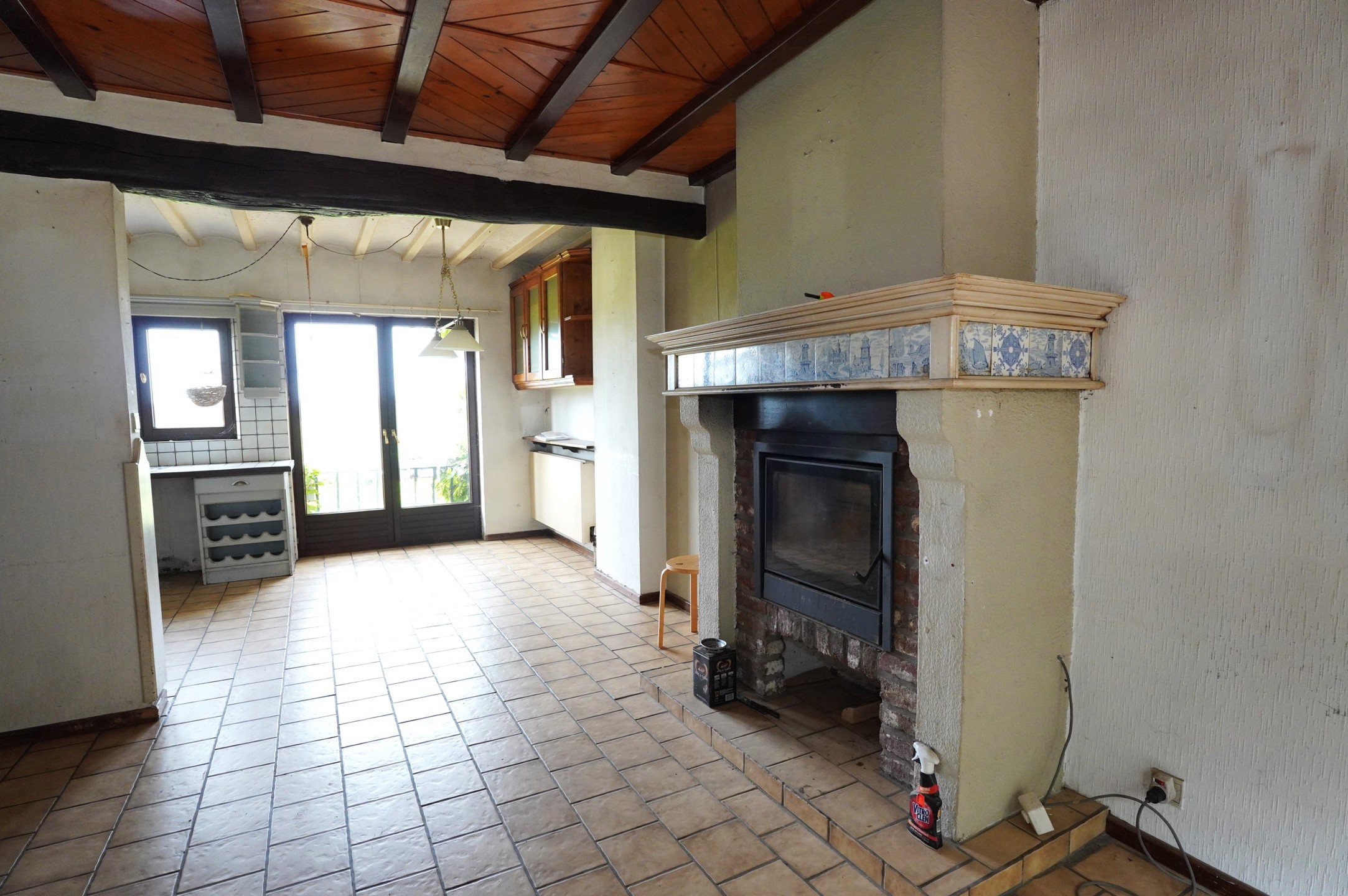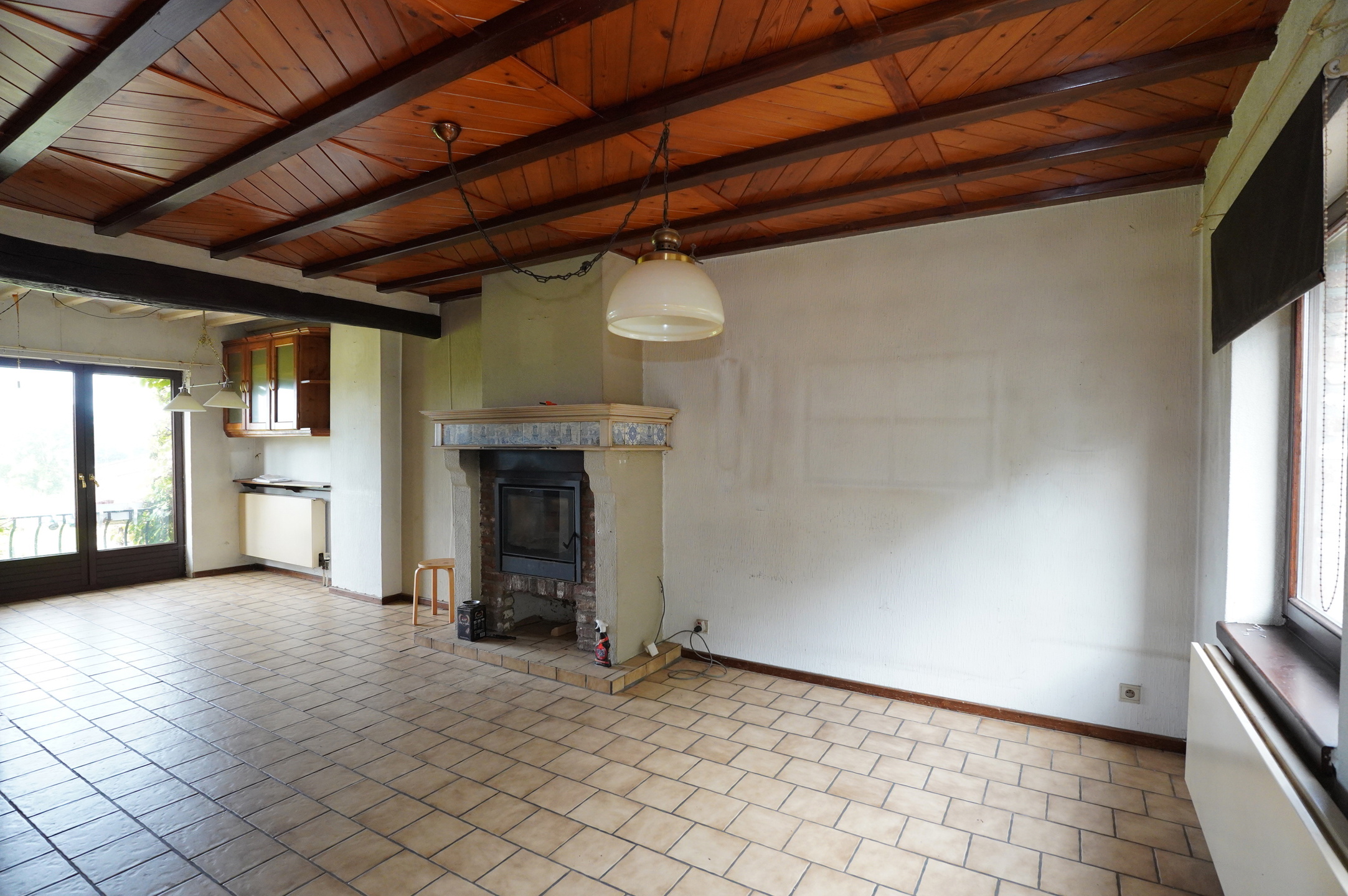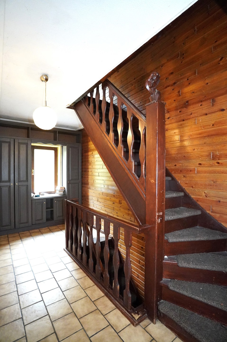 1° Etage : Cage d’escalier en bois avec armoires sur mesures menant au second étage, hall de nuit, spacieux living avec poêle à bois ouvert sur la cuisine meublée, salle de bain avec bain, lavabo et wc, 2 chambres à coucher dont une est équipée d’armoires encastrées sur mesure. Les sols sont recouverts de carrelages.