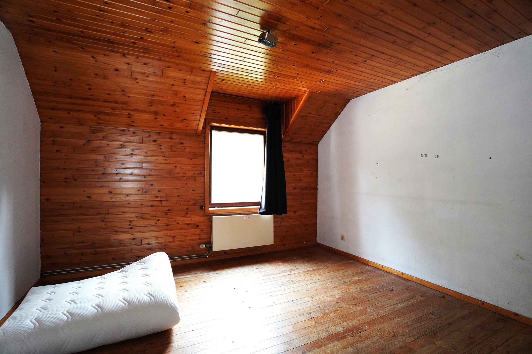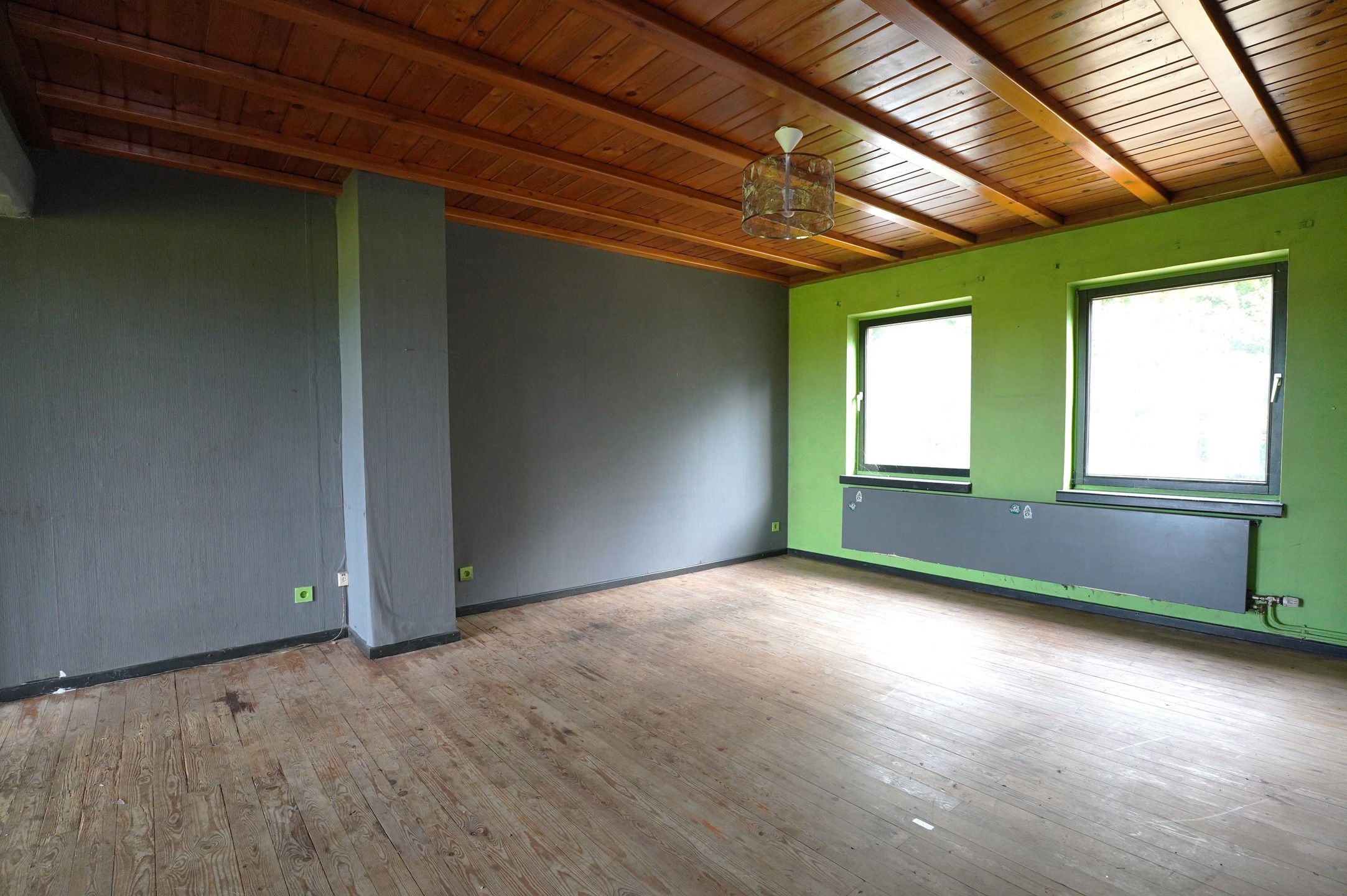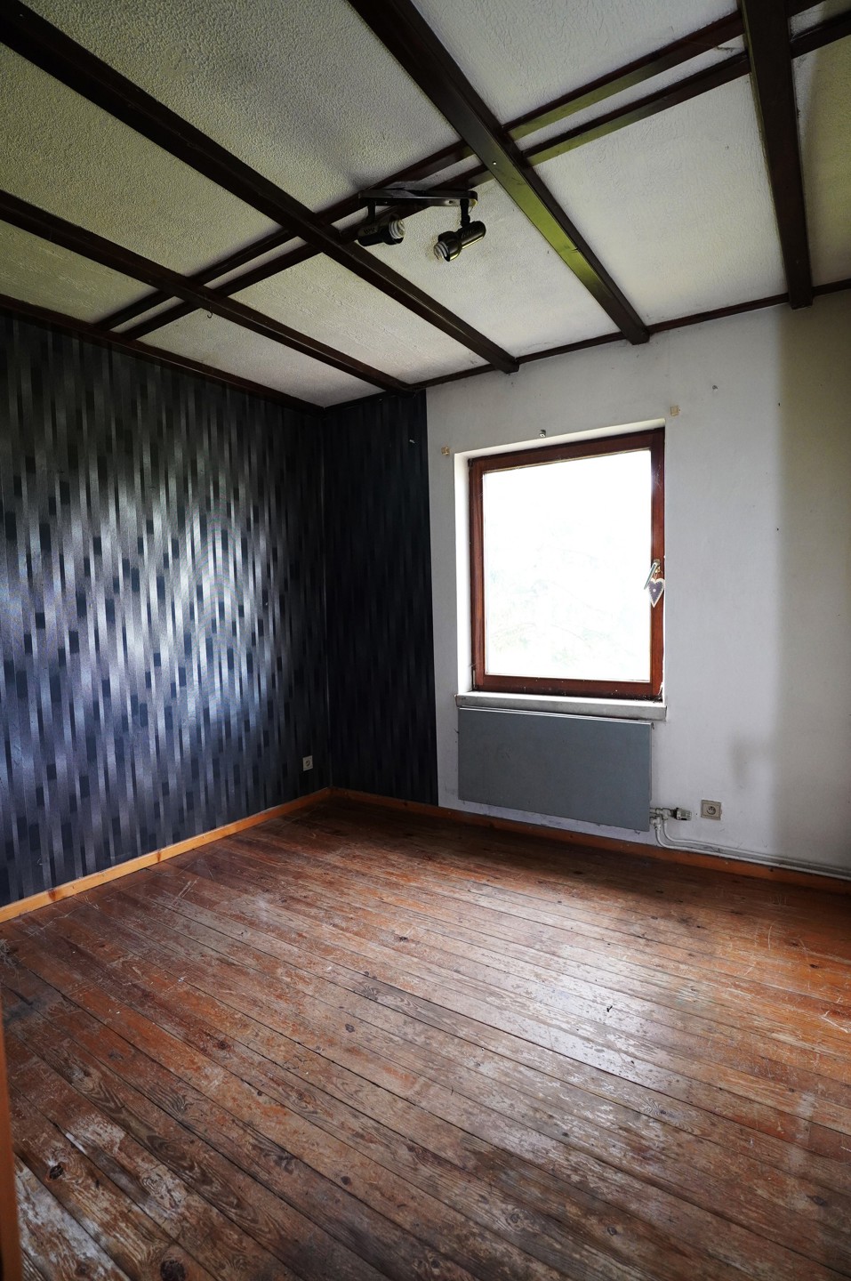 2° Etage : Cage d’escalier en bois, hall de nuit, spacieux living ouvert sur l’espace prévu pour une cuisine, salle de bain avec bain lavabo et wc, 2 chambres à coucher. Les sols sont recouverts de parquet massif.