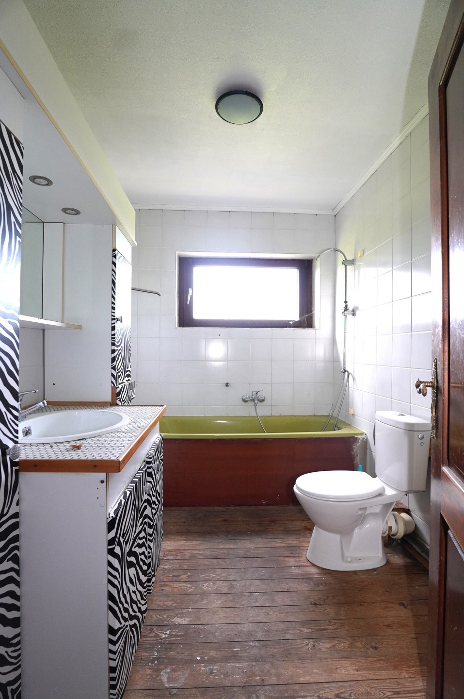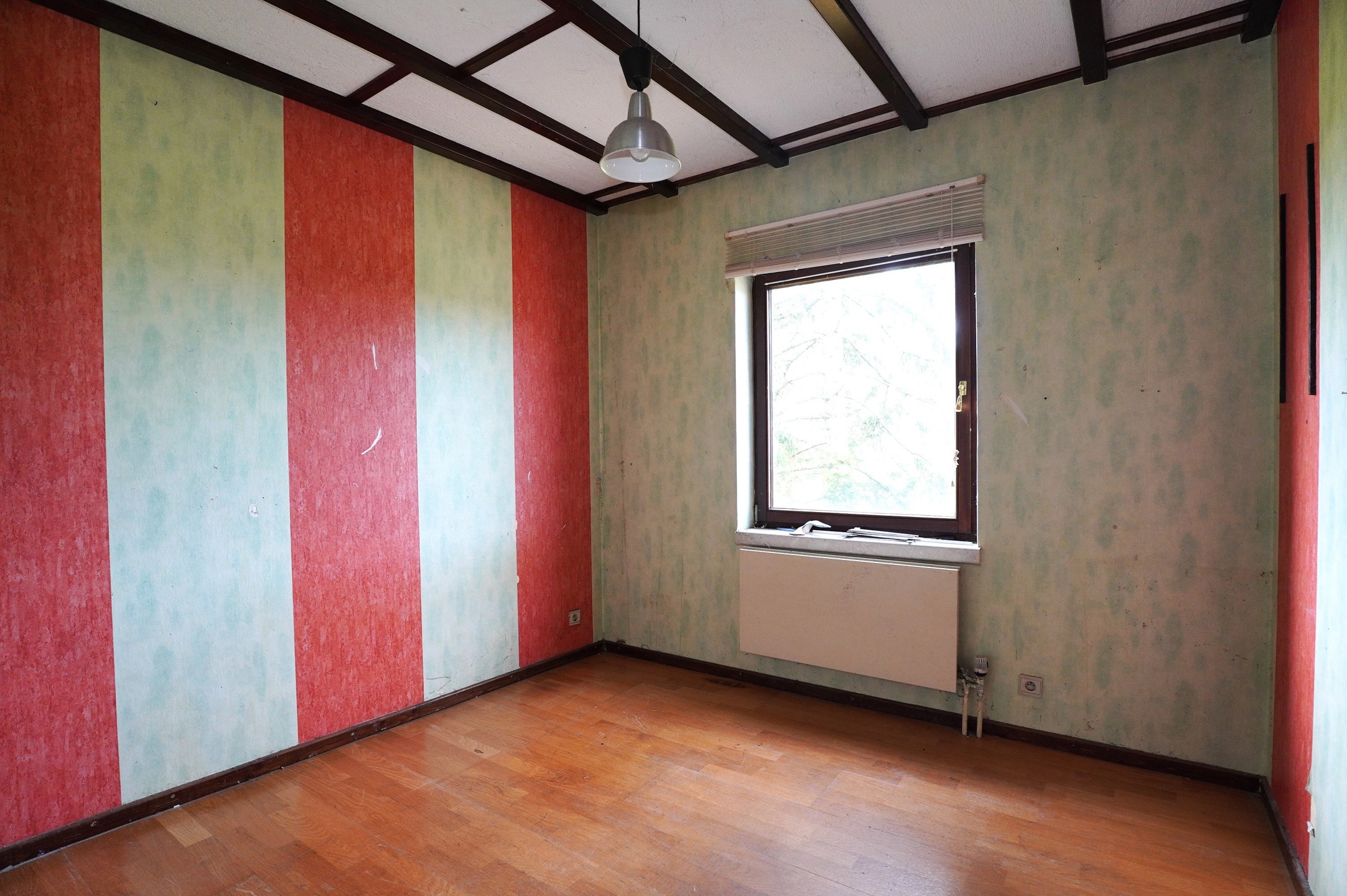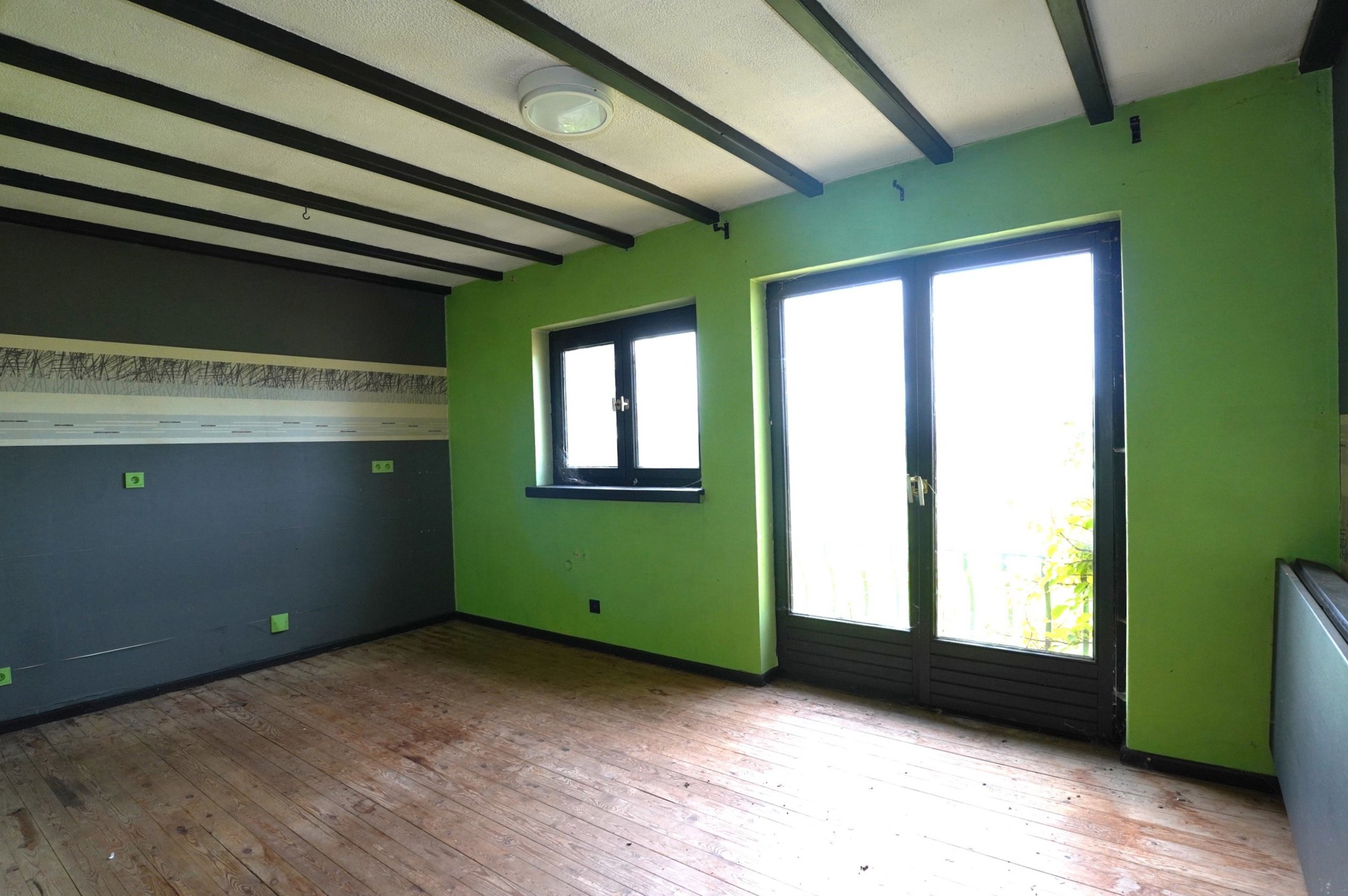 2° Etage : Cage d’escalier en bois, hall de nuit, spacieux living ouvert sur l’espace prévu pour une cuisine, salle de bain avec bain lavabo et wc, 2 chambres à coucher. Les sols sont recouverts de parquet massif.