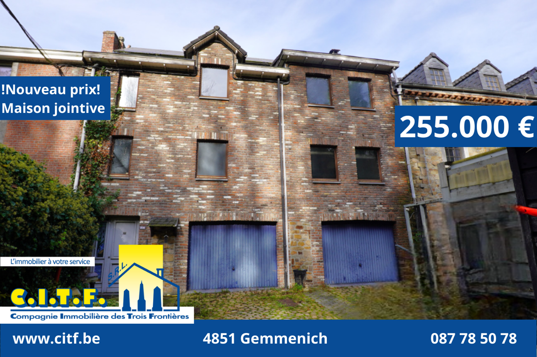!NOUVEAU PRIX! Spacieuse maison jointive avec deux garages, parkings et jardin sise rue du Village 161 à Moresnet.
