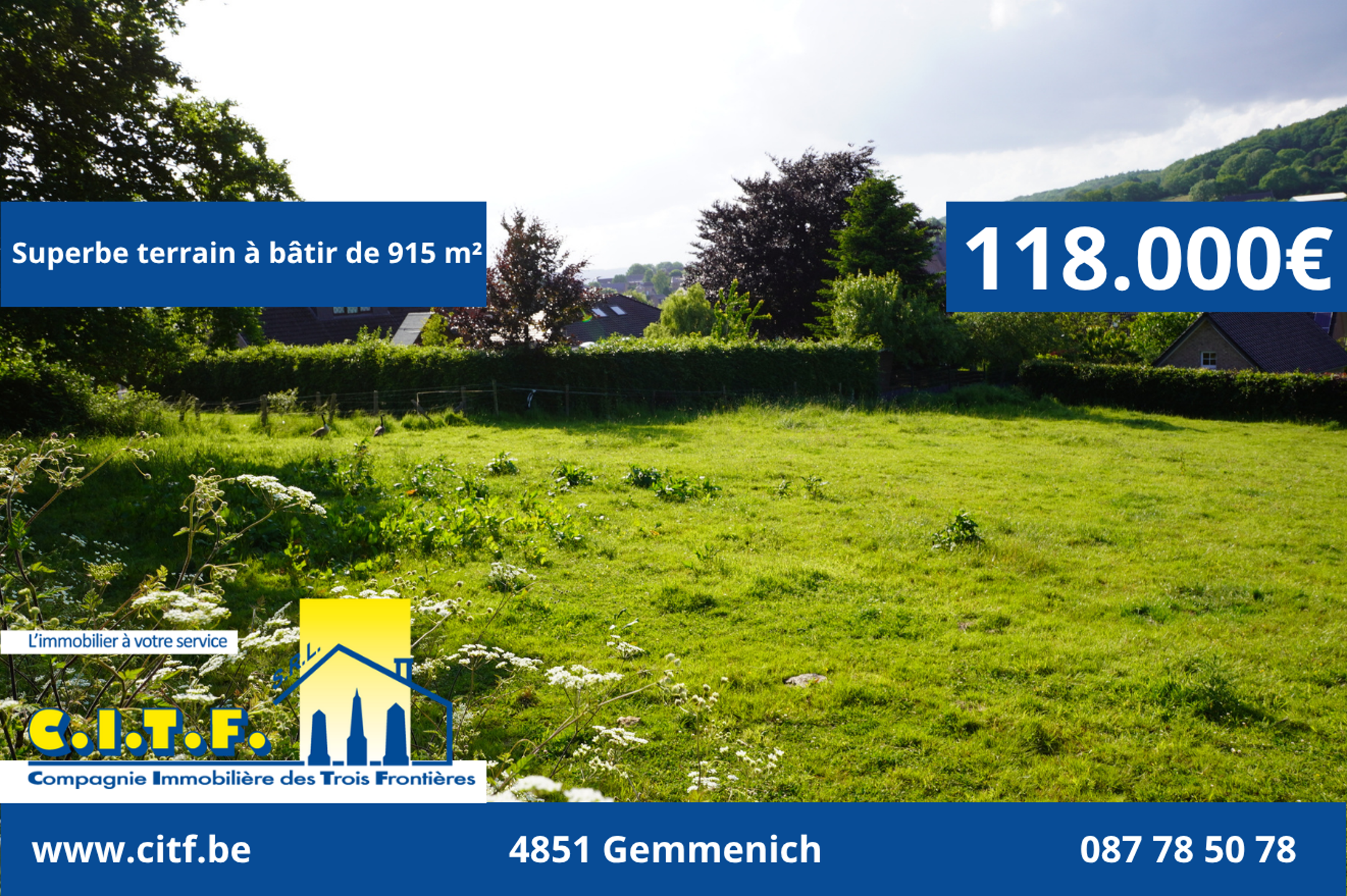 Prachtige bouwgrond van 915 m², gelegen in een idyllische wijk van Gemmenich, Rue Pinaye Lot 1, dicht bij de natuur met uitzicht op de vallei, het dorp, de weilanden en het bos dat de drie grenzen van België, Duitsland en Nederland verbindt.