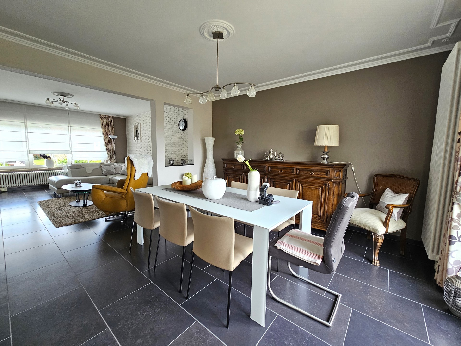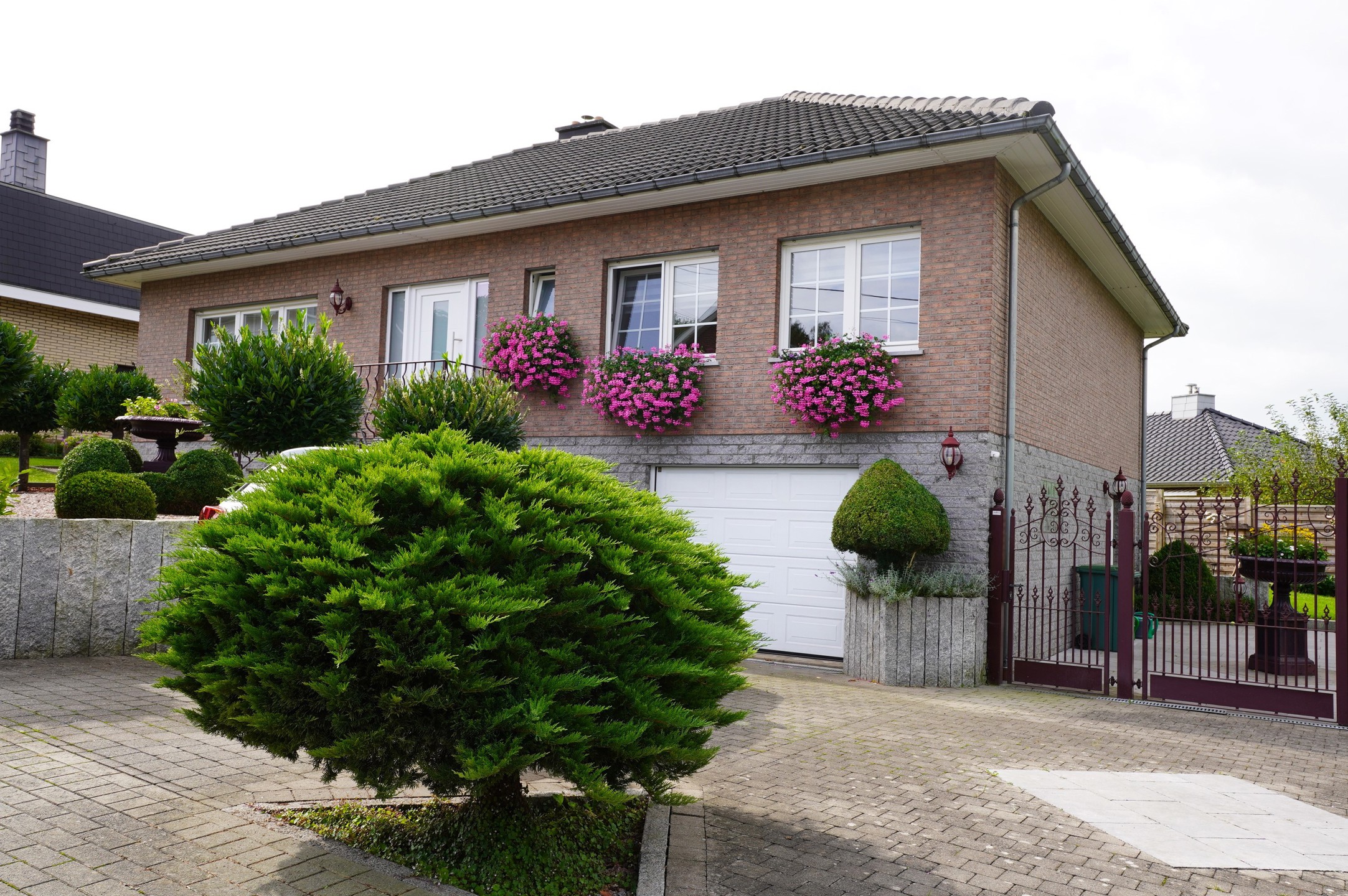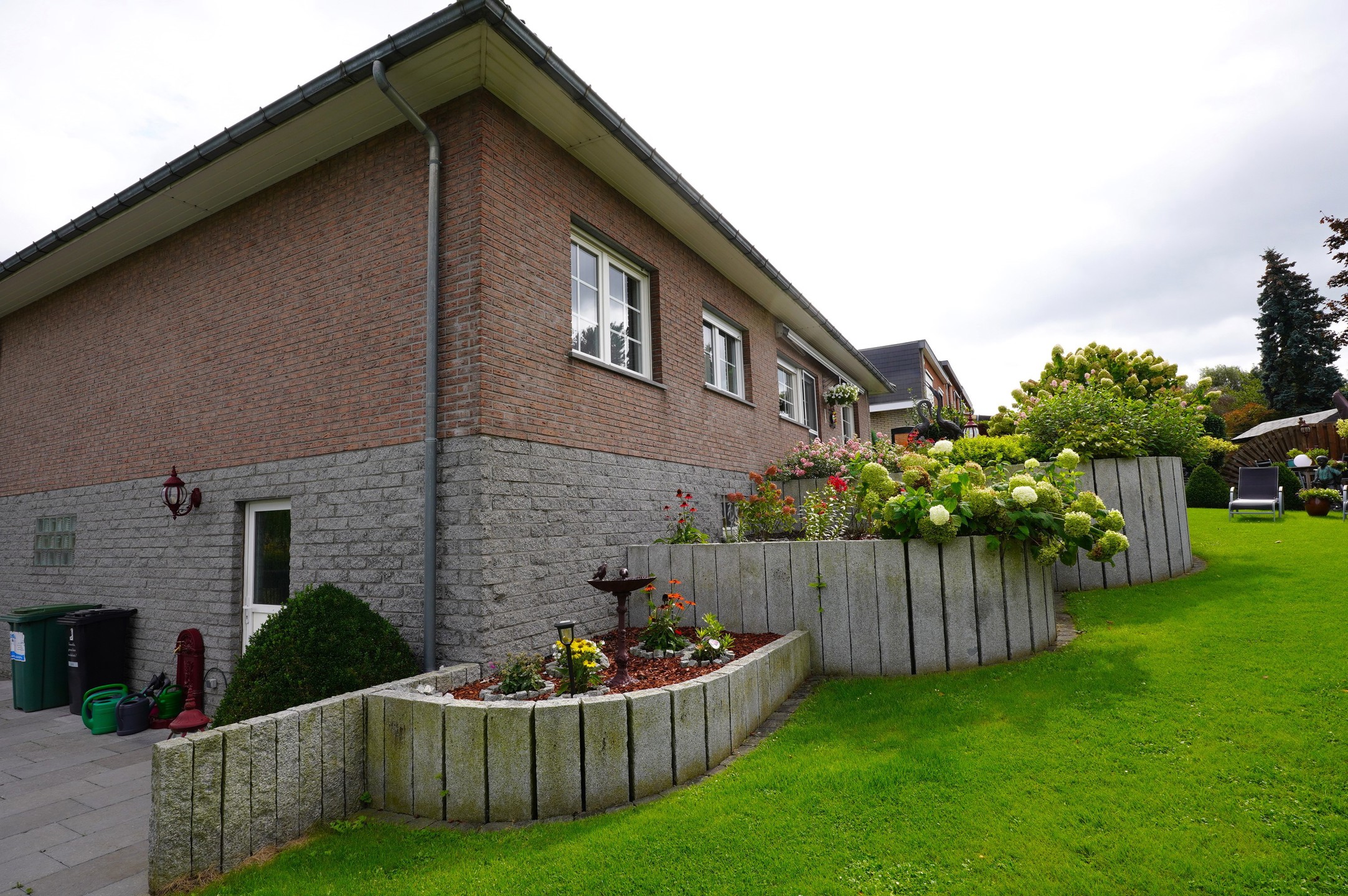 Het huis valt op door zijn tijdloze karakter, aangevuld met een letterlijk kraaknet interieur, een groene touch en verschillende bloembedden. Vooral de voortuin is een blikvanger, terwijl de achtertuin, die op verschillende niveaus is aangelegd, met een betegeld terras en een gezellige zithoek, dankzij het natuurlijke privacy (hagen), de gewenste afzondering garandeert, zodat men optimaal van de zon kan genieten.