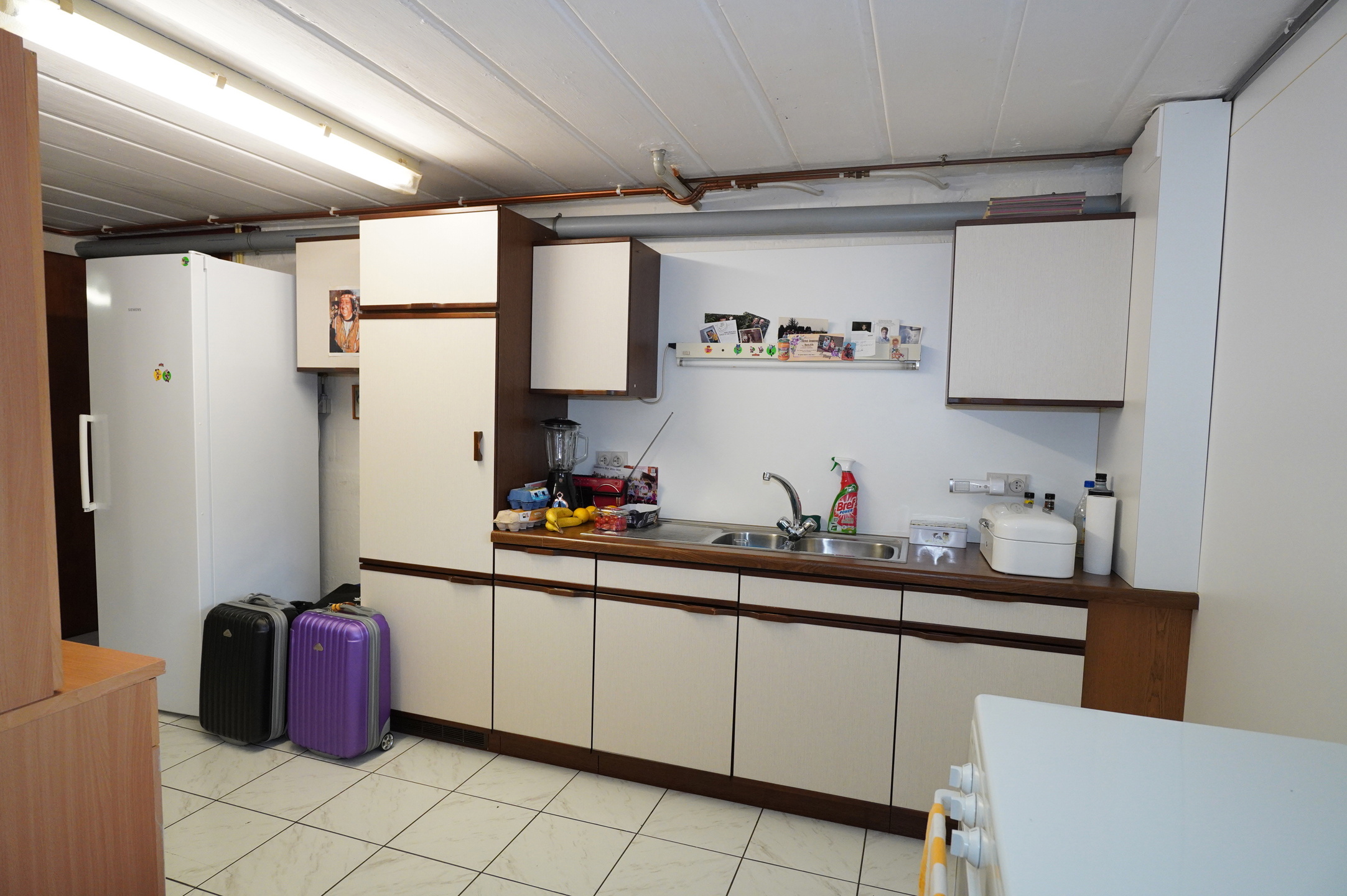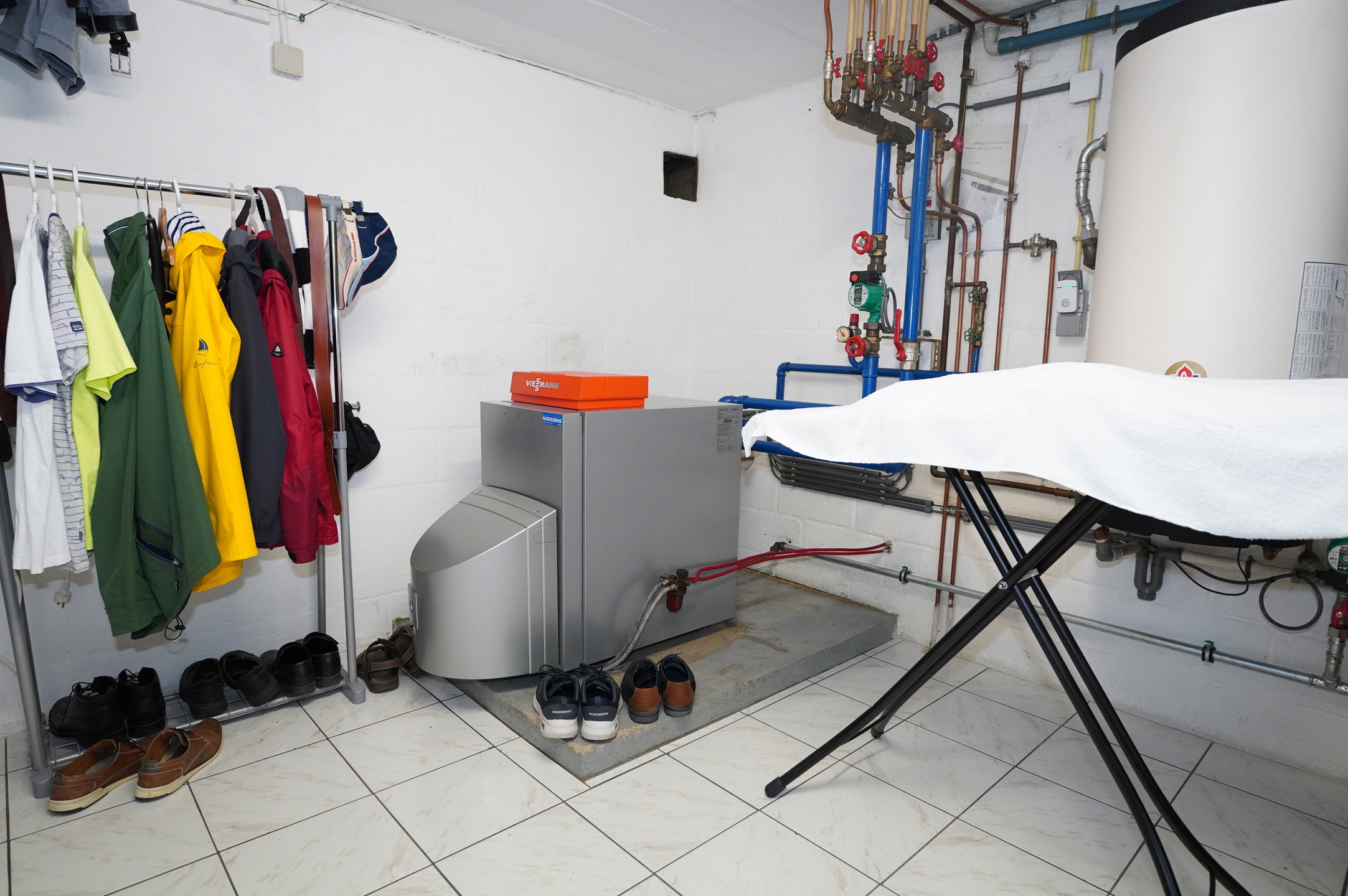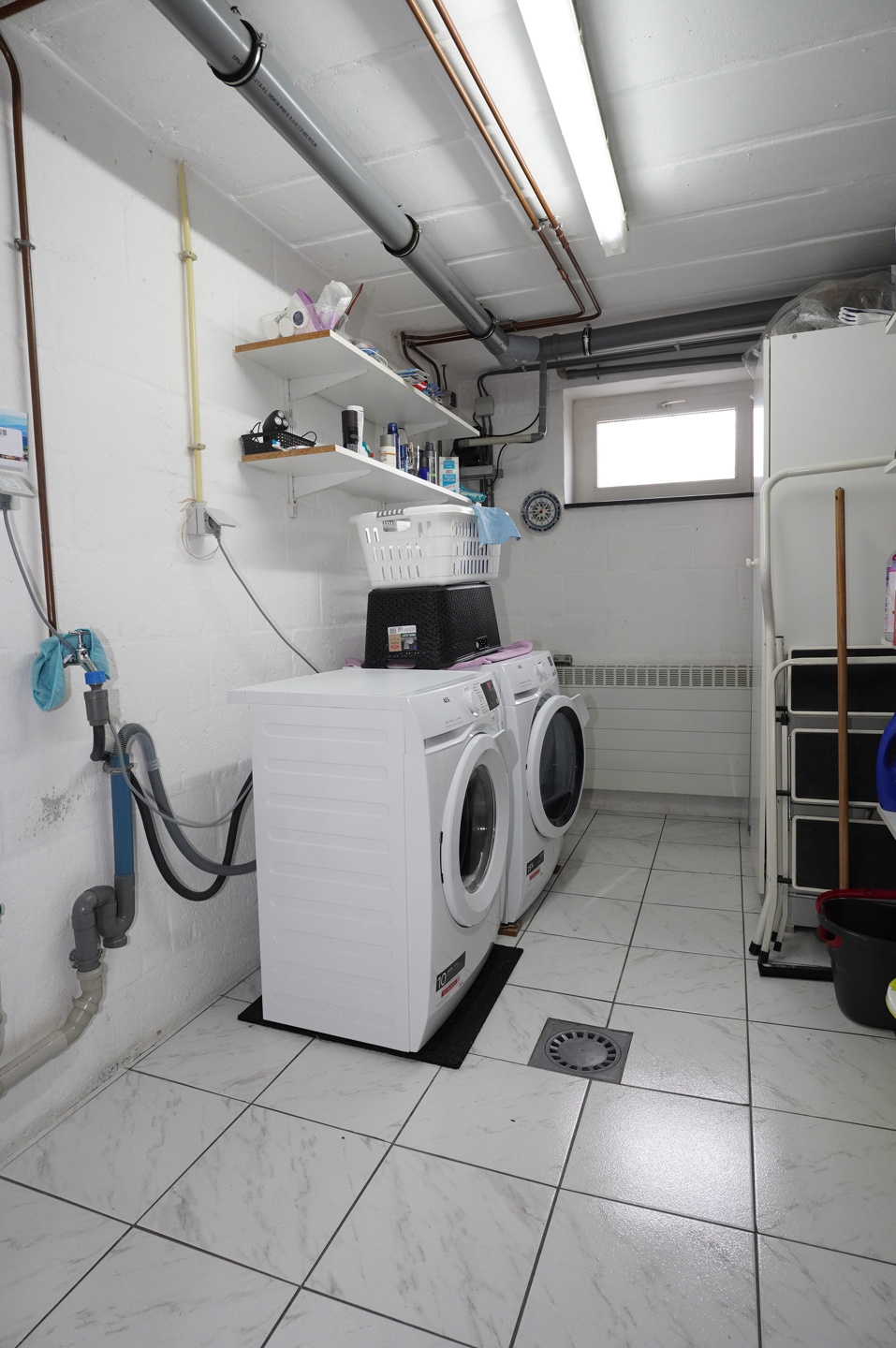 De kelder bestaat uit een hal, een stookruimte met het centrale Viessmann olieverwarmingssysteem, een bijkeuken met aansluitingen voor de wasmachine, een grote garage met toegang tot de tuin en twee opslagruimtes, waarvan er een is uitgerust met de olietank (2500 liter).