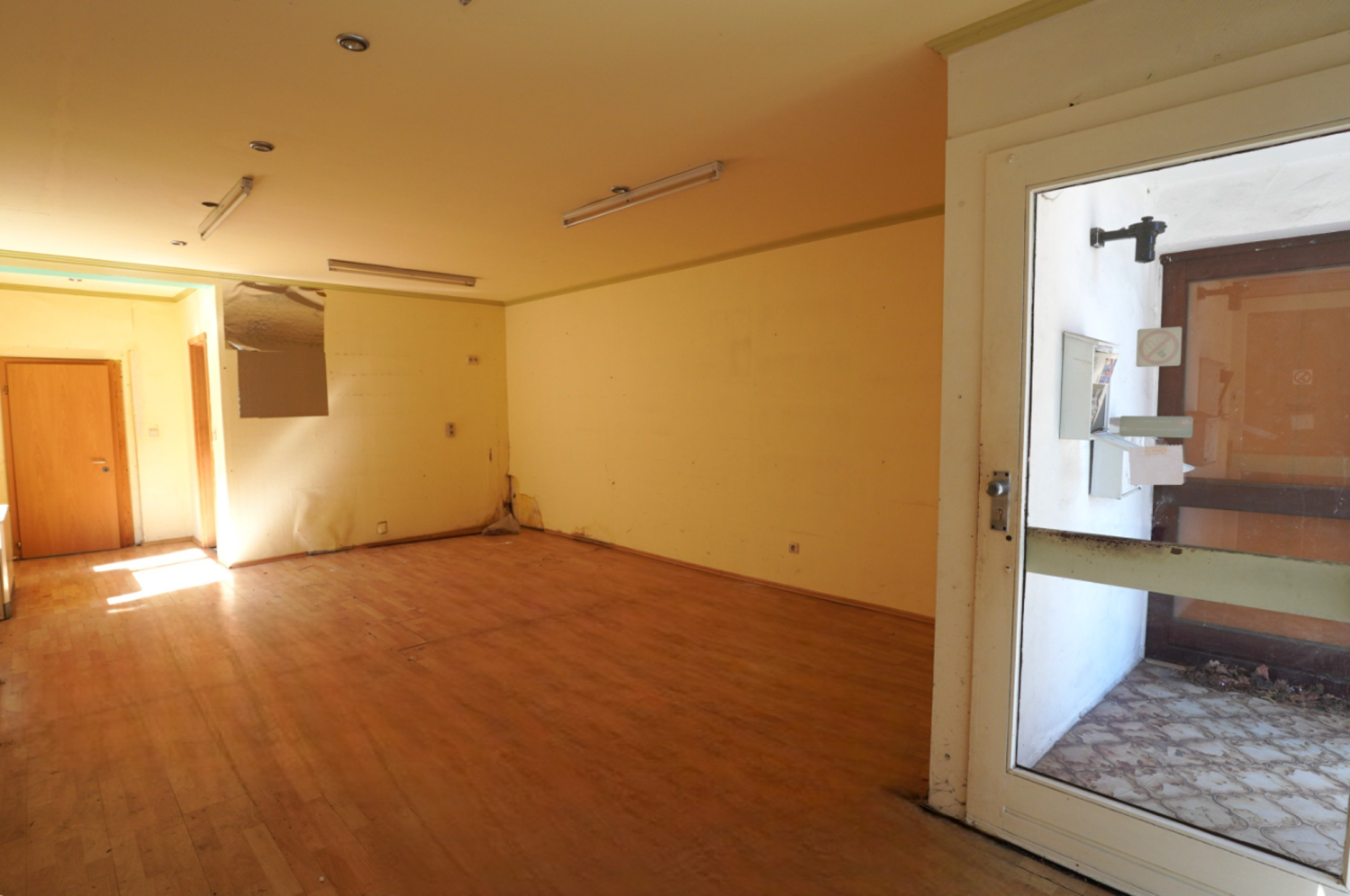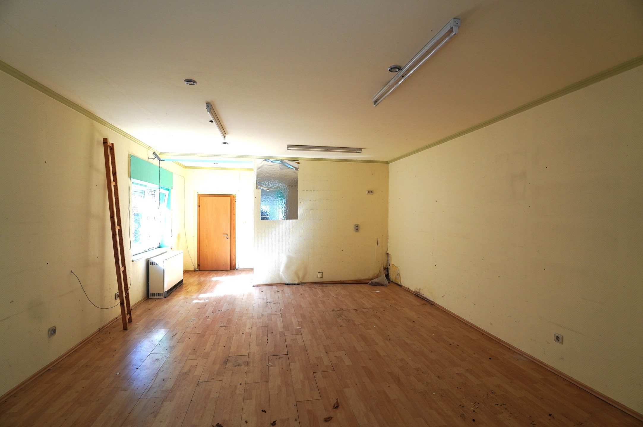 Vastgoed begane grond : interessante dubbele begane grond die verbouwd en geoptimaliseerd moet worden, midden in het centrum van Kelmis, Rue Thym 21-23, grenzend aan de Stiefelstrasse.
